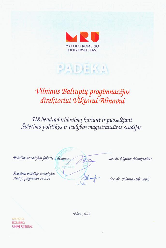 Baltupių progimnazijos direktorius dalyvavo trečius metus sėkmingai vykdomos „Švietimo politikos ir vadybos“ magistrantūros studijų programos padėkos šventėje, kurios metu padėkota partneriams už palaikymą ir bendradarbiavimą kuriant studijų programą, organizuojant studijas bei vykdant švietimo valdymo tyrimus. Progimnazija gavo padėkos raštą. Susirinkusieji pasidalino savo patirtimi bei diskutavo apie tolimesnio bendradarbiavimo perspektyvas, bendrą projektinę veiklą.