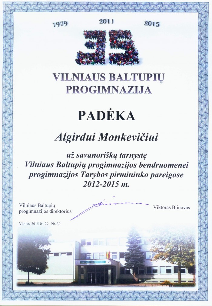 4 gegužės, 2015 Category: Naujienos Komentavimas išjungtas įraše Baltupių progimnazijos Tarybos pirmininkas Algirdas Monkevičius inauguruotas MRU rektoriumi Plačiau>>>